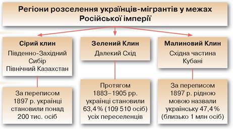 Демографічне зростання загострювало земельну проблему. У селі з’явився надлишок робочої сили (аграрне перенаселення). Це стало причиною активізації міграційних рухів. У пошуках джерел існування українські селяни почали залишати рідні місця і переселятися на малозаселені землі імперії. Уряд тривалий час забороняв переселення, тому правила, встановлені для переселенців, були складні. У 1881 р. під тиском селян царизм пішов на деякі поступки в переселенському питанні. Відтак українське селянство переважно з лівобережних губерній почало масово переселятися в східні райони Російської імперії. Активізації переселенських рухів сприяло також будівництво залізниць. Так сформувалися три регіони найбільш компактного проживання українців — Сірий Клин, Зелений Клин і Малиновий Клин.