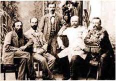 Діячі Київської громади: у центрі стоїть В. Антонович, сидять зліва направо: Т. Рильський, В. Беренштам, Ф. Панченко, Б. Познанський (фото кінця XIX ст.)