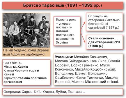 Безпосереднім наслідком радикалізації української активної молоді була поява на початку 1890-х років таємної організації Братство тарасівців. Біля її витоків стояли київські та харківські студенти Іван Липа, Борис Грінченко, Микола Міхновський та ін. Організаційно братство оформилося під час зустрічі його фундаторів на могилі Т. Шевченка в Каневі й ставило за мету реалізувати його основні ідеї.