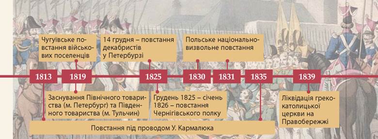 • Ліквідація царською владою греко-католицької церкви на Правобережжі • повстання Чернігівського полку • Польське повстання • повстання військових поселенців у Чугуєві.