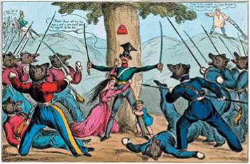 Проаналізуйте англійську карикатуру й дайте відповіді на запитання. • 1. Що зображено на карикатурі? • 2. Який символічний зміст вклав автор у зображення? • 3. Яке ставлення до події намагався сформувати автор у глядачів? • 4. Які світоглядні ідеали доби втілено в карикатурі?