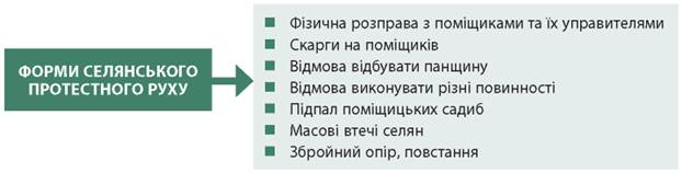 Проаналізуйте схему й дайте відповіді на запитання. • 1. Які форми протестного руху селян вона ілюструє? Чого прагнули селяни, проти чого боролися? • 2. Які форми протесту в сучасному демократичному суспільстві вам відомі? • 3. Чи існували демократичні механізми боротьби за соціальні права в першій половині XIX ст.? Чи доречно звинувачувати тих селян, які вдавалися до радикальних методів боротьби з поміщиками, у соціальному бандитизмі? Чому?