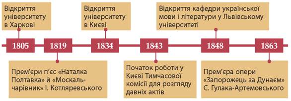 1. Істотний внесок у розвиток вітчизняної науки, попри несприятливі умови, зробили Харківський і Київський університети. 2. Українське музичне мистецтво живилося народною пісенною творчістю. 3. Народження нового виду музичної драматургії відбулося на ґрунті національних мистецьких традицій. 4. На перший план вийшла світська музика, розвивали всі жанри, представлені на той час у європейському музичному мистецтві.