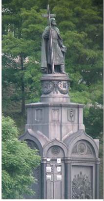Пам’ятник князю Володимиру в Києві встановлено 1853 р. на нижній (штучній) терасі гірки, яка отримала назву Володимирської. Загальна висота пам’ятника - 20,4 м, висота бронзової статуї - 4,4 м, висота постаменту - 16 м. На постаменті установлено статую князя на повний зріст, зображеного в парадному плащі, з хрестом у правій руці та облямованій хутром шапці - у лівій. Скульптурне оформлення постаменту складається з горельєфа «Хрещення Русі»; барельєфа з гербом Києва (архістратиг Михаїл на повний зріст); зірки ордена Святого Володимира.