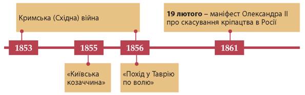 • «Київська козаччина» • початок Кримської війни • оприлюднення маніфесту царя Олександра II про скасування кріпацтва.