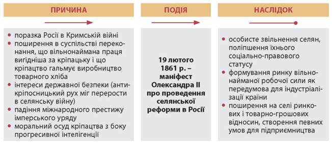 Обговоріть, чому серед причин проведення селянської реформи найістотнішою вважають поразку в Кримській війні. Який із наслідків селянської реформи зумовив такі зміни: розвиток ринку землі, що передбачало купівлю-продаж землі, її оренду; розвиток особистості, формування індивідуальної ідентичності селян; залучення селян до роботи на промислових об’єктах, до будівництва залізниць?