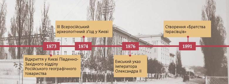 • Ухвалення Емського указу імператором Олександром II • створення «Братства тарасівців» • відкриття Південно-Західного відділу Російського географічного товариства • заснування газети «Перекладач-Терджиман».