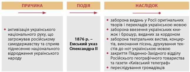 Піднесення українського руху спричинило посилення утисків і переслідування з боку самодержавства. Поштовхом до них став донос, який надійшов з Києва до Петербурга наприкінці 1874 р., про те, що українці хочуть вільної України у формі республіки з «гетьманом на чолі». У серпні 1875 р. за наказом Олександра II було створено спеціальну комісію, яка й запропонувала заходи боротьби з українофільством: заборону видань у Росії оригінальних творів і перекладів українською мовою, ввезення українських книжок і брошур, виданих за кордоном; театральних вистав, концертів, виконання пісень, друкування текстів до нот українською мовою (виняток становили історичні документи та певною мірою художні твори, але з уживанням лише літер російського правопису); видання газети «Київський телеграф», а також вислання Михайла Драгоманова та Павла Чубинського за межі України як «невиправних і безперечно небезпечних агітаторів».
