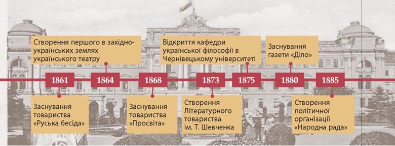• Створення політичної організації «Народна рада» • створення у Львові Літературного товариства ім. Т. Шевченка • заснування у Львові товариства «Просвіта» • створення у Львові при «Руській бесіді» першого в західноукраїнських землях українського театру.