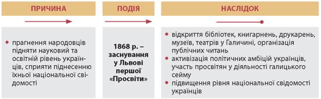 Основним завданням створеного народовцями в 1868 р. українського культурно-освітнього товариства «Просвіта» стало поширення письменності, освіти в широкому розумінні цього слова. Товариство видавало твори видатних українських письменників, шкільні підручники, літературно-наукові альманахи, популярні брошури, створювало читальні, поширюючи свої заходи й на селян. Незабаром з’явилися філії «Просвіти» та читальні в повітових містах і селах по всій Галичині й Буковині.