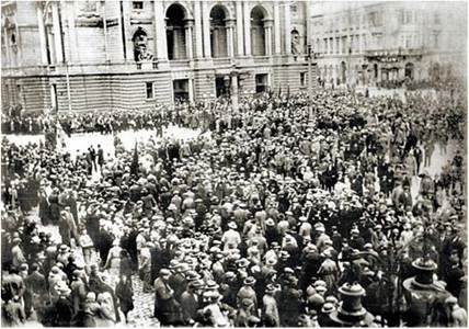 Демонстрація перед міським театром у Львові, організована політичними партіями під гаслом проведення у краї виборчої реформи. 1905 р.