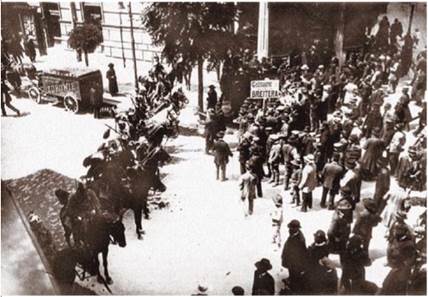 Кіннота австрійської жандармерії перетнула шлях демонстрантам, які прямують до будинку Галицького сейму у Львові. 1911 р.