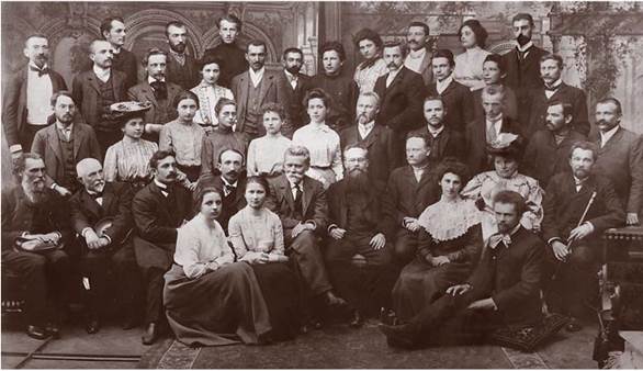 Слухачі й слухачки літніх наукових курсів у Львові та їхні викладачі й викладачки. У центрі М. Грушевський, І. Франко. Однією з організоторок курсів була вчителька, перекладачка, просвітниця М. Грушевська. 1904 р.