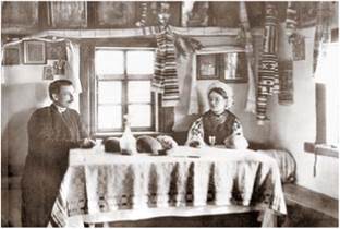 Парубок і дівчина за столом у хаті. Фото 1903 р.