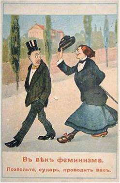 Карикатура початку XX ст. Напис «В Добу Фемінізму. Дозвольте, пане, проводжу вас»