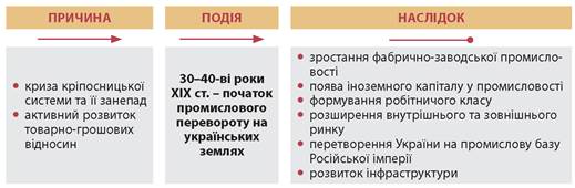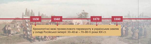 Промисловий переворот (індустріальна революція) - перехід від мануфактури до великого машинного фабрично-заводського виробництва. На українських землях у складі Російської імперії розпочався у 30-40-ві і завершився в 70-80-х роках XIX ст.
