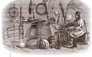 «Вони вбиралися в полотняний одяг, просякнутий дьогтем; свитка, батіг, пласка бочка з водою, мазниця з дьогтем і казанок для варіння пшоняної каші з салом, тут на вулиці між возами і було все майно чумака» (А. Скальковський).