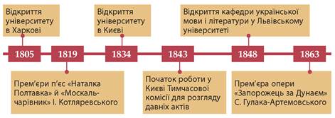 1. Істотний внесок у розвиток вітчизняної науки, попри несприятливі умови, зробили Харківський і Київський університети. 2. Українське музичне мистецтво живилося народною пісенною творчістю. 3. Народження нового виду музичної драматургії відбулося на ґрунті національних мистецьких традицій. 4. На перший план вийшла світська музика, розвивали всі жанри, представлені на той час у європейському музичному мистецтві.