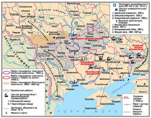 Проаналізуйте карту на с. 118. · 1. Які історичні факти (події, явища, процеси) другої половини XIX ст. відображено на ній? · 2. Які історико-географічні об’єкти, позначені на карті, свідчать про модернізацію промисловості та сільського господарства? · 3. Порівняйте карти на с. 118 і на с. 23. Чи відбулися зміни адміністративно-територіального устрою в підросійській Україні в другій половині XIX ст.?