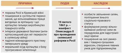 «Реформа 1861 р. вивільнила селян від особистої залежності, а з іншого боку, виштовхувала їх заради сплати викупних платежів і податків на товарний ринок і ринок робочої сили».