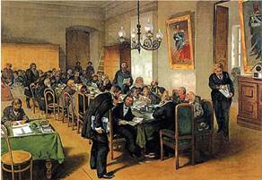 Повітове земське зібрання в обідню пору. Художник Г. Мясоєдов. 1872 р.
