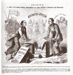 Карикатура на диспут між Миколою Костомаровим і російським істориком Михайлом Погодіним про походження Русі