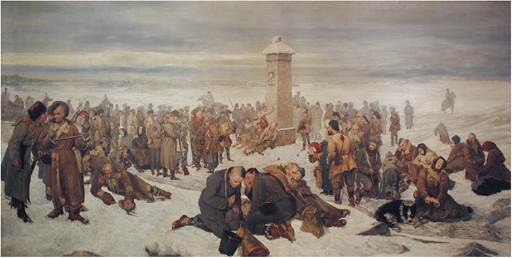 До вересня повстання, що розгорталося на теренах Царства Польського, Литви й частково Білорусі та Правобережної України, було придушене. Російський уряд жорстоко розправився з учасниками повстання: сотні поляків було страчено, тисячі вислано до Сибіру. На картині (с. 139) зображено привал на кордоні Європи та Азії учасників польського повстання, які прямують на каторгу і заслання до Сибіру.