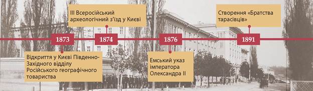 • Ухвалення Емського указу імператором Олександром II • створення «Братства тарасівців» • відкриття Південно-Західного відділу Російського географічного товариства • заснування газети «Перекладач-Терджиман».