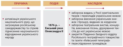 Піднесення українського руху спричинило посилення утисків і переслідування з боку самодержавства. Поштовхом до них став донос, який надійшов з Києва до Петербурга наприкінці 1874 р., про те, що українці хочуть вільної України у формі республіки з «гетьманом на чолі». У серпні 1875 р. за наказом Олександра II було створено спеціальну комісію, яка й запропонувала заходи боротьби з українофільством: заборону видань у Росії оригінальних творів і перекладів українською мовою, ввезення українських книжок і брошур, виданих за кордоном; театральних вистав, концертів, виконання пісень, друкування текстів до нот українською мовою (виняток становили історичні документи та певною мірою художні твори, але з уживанням лише літер російського правопису); видання газети «Київський телеграф», а також вислання Михайла Драгоманова та Павла Чубинського за межі України як «невиправних і безперечно небезпечних агітаторів».