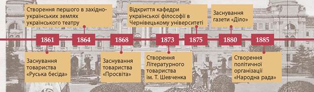 • Створення політичної організації «Народна рада» • створення у Львові Літературного товариства ім. Т. Шевченка • заснування у Львові товариства «Просвіта» • створення у Львові при «Руській бесіді» першого в західноукраїнських землях українського театру.