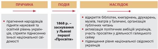 Основним завданням створеного народовцями в 1868 р. українського культурно-освітнього товариства «Просвіта» стало поширення письменності, освіти в широкому розумінні цього слова. Товариство видавало твори видатних українських письменників, шкільні підручники, літературно-наукові альманахи, популярні брошури, створювало читальні, поширюючи свої заходи й на селян. Незабаром з’явилися філії «Просвіти» та читальні в повітових містах і селах по всій Галичині й Буковині.