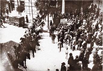 Кіннота австрійської жандармерії перетнула шлях демонстрантам, які прямують до будинку Галицького сейму у Львові. 1911 р.