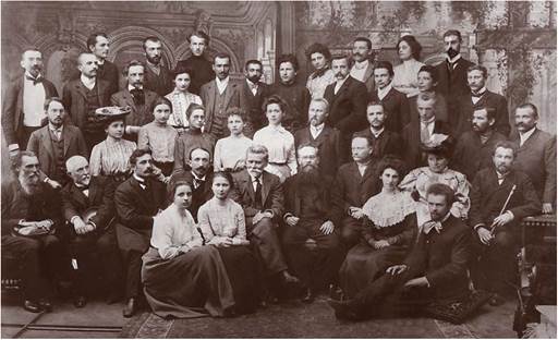 Слухачі й слухачки літніх наукових курсів у Львові та їхні викладачі й викладачки. У центрі М. Грушевський, І. Франко. Однією з організоторок курсів була вчителька, перекладачка, просвітниця М. Грушевська. 1904 р.