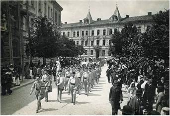 Учасники Шевченківського здвигу 1914 р. крокують вулицями Львова