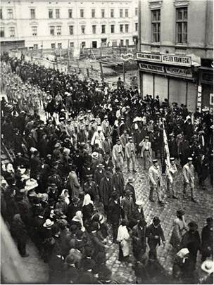 4. Колона учасників І Краєвого здвигу під час урочистої маніфестації вулицею Коперника у Львові. Попереду колони хорунжі з прапором (зліва направо: Володимир Гузар, Іван Кревецький, Броніслав Бурбела), за ними президія «Сокола-Батька» (зліва направо: Льонгин Цегельський, Іван Боберський, Михайло Волошин); услід за старшиною почесні гості: Франц Машек (за Іваном Боберським), у козацькому білому вбранні відпоручник «Просвіти» з Катеринославщини. 10 вересня 1911 р.