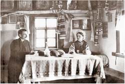 Парубок і дівчина за столом у хаті. Фото 1903 р.