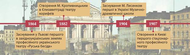 • Заснування М. Лисенком першої в Україні Музично-драматичної школи • створення М. Кропивницьким в Єлизаветграді театру корифеїв • створення в Києві першого стаціонарного професійного театру • заснування у Львові першого професійного українського театру «Руська бесіда».