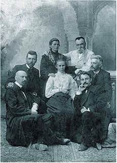 Письменники та письменниці на відкритті пам’ятника І. Котляревському в Полтаві (зліва направо): М. Коцюбинський, В. Стефаник, Олена Пчілка, Леся Українка, М. Старицький, Г. Хоткевич, В. Самійленко. 1903 р.