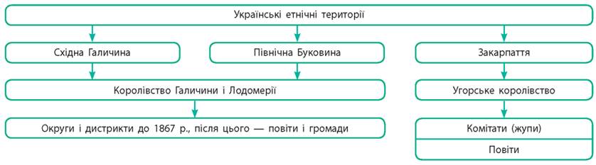 Робота у парах. Порівняйте за схемами адміністративно-територіальний устрій та регіональний поділ українських етнічних територій у складі Російської та Австрійської імперій.