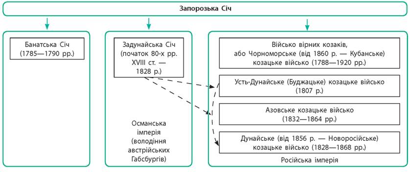 3. Козацтво після ліквідації Запорозької Січі. Після ліквідації Запорозької Січі одна частина козацтва залишилася на землях Російської імперії, друга — знайшла притулок в Османській імперії (див. схему). Трагедія цих людей поглиблювалася тим, що під час російсько-турецьких війн вони були змушені воювати з єдиновірцями. Служба двом імперіям формально зберігала козацтво, але зміст їхньої служби зазнав змін. Проте навіть за таких умов козацтво зберігало свою культуру, традиції й історичну пам’ять.