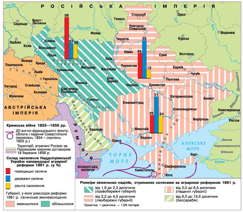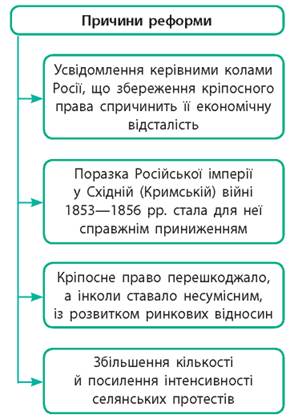2. Які зміни відбулися в економічному розвитку українських земель у складі Російської імперії в середині XIX ст. порівняно з попереднім періодом? 3. Розкрийте взаємозв’язок між передумовами і причинами селянської реформи. 4. Висловіть обґрунтовану думку щодо того, чи вплинули російські «великі реформи» 60—70-х рр. XIX ст. на розвиток українських земель.