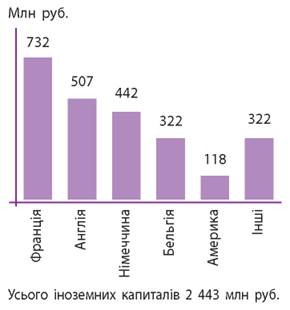 По-друге, у промисловості панівну роль відігравав іноземний капітал. Особливо чітко це виявлялося в Донецько-Криворізькому промисловому районі, де значна кількість шахт, рудників, заводів належала іноземцям. Так, у чорній металургії Півдня діяло 18 акціонерних підприємств, капітал 12 з яких повністю належав іноземним компаніям (бельгійським, французьким, британським, німецьким), а в інших був мішаним. Понад 25 % іноземного капіталу, вкладеного в економіку Російської імперії, припадало на українські землі. Зокрема, у вугільній промисловості іноземцям належало 63 % основного капіталу, у металургії — 90 %. У нафтодобувній промисловості на українських землях у складі Австро-Угорщини, яка давала 5 % світового видобутку нафти, контроль за іноземним капіталом (німецьким, британським, французьким) був повним.
