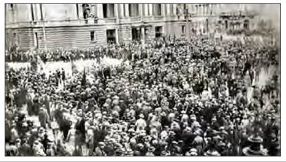Демонстрація перед міським театром у Львові, організована політичними партіями під гаслом проведення у краї виборчої реформи. 1905 р.