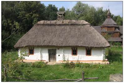 Побілена дерев’яна хата із солом’яною стріхою із села Луги на Поділлі. XIX ст.