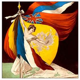Алегоричне зображення Антанти, що тримає в руках прапори основних країн — учасників блоку та їхніх союзників