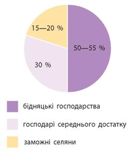 - бідні селяни, або бідняки, що стали найчисленнішою групою тогочасного сільського населення. Вони взагалі не мали землі або мали недостатню її кількість для того, щоб прогодувати себе і свою родину. Бідняки наймалися працювати до заможних односельців і поміщиків або шукали іншої сезонної роботи.