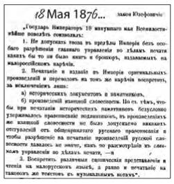 - 1) Не допускати ввозу в межі імперії без окремого на те дозволу Головного управління будь-яких книг і брошур, що видаються за кордоном на малоросійському наріччі.