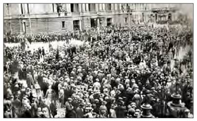 Демонстрація перед міським театром у Львові, організована політичними партіями під гаслом проведення у краї виборчої реформи. 1905 р.