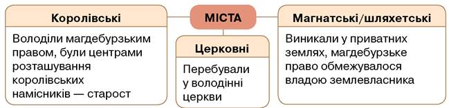 В Україні існувало понад 1100 міст і містечок. Міста відрізнялися за своїм статусом. Королівськими містами зазвичай були центри воєводств і повітів: Київ, Брацлав, Житомир, Луцьк, Львів тощо.