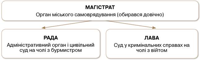 Міста, що мали магдебурзьке право, повністю або частково управлялися магістратом — виборним становим органом, що складався з ради й лави.
